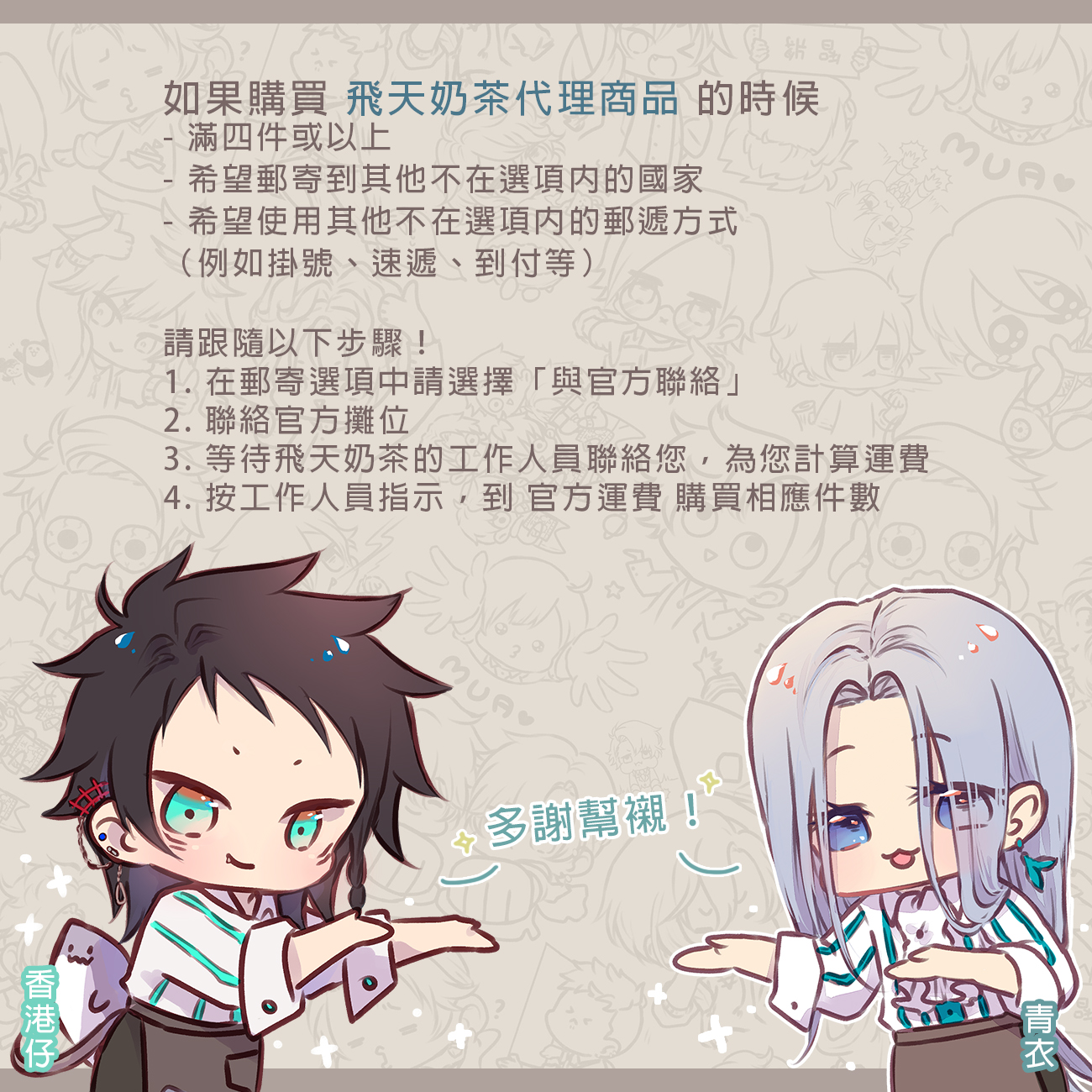 👇🏻凡是購買 飛天奶茶代理商品 滿四件或以上、或希望郵寄到其他不在選項內的國家、或希望使用其他不在選項內的郵遞方式(例如掛號、速遞、到付等)👇🏻