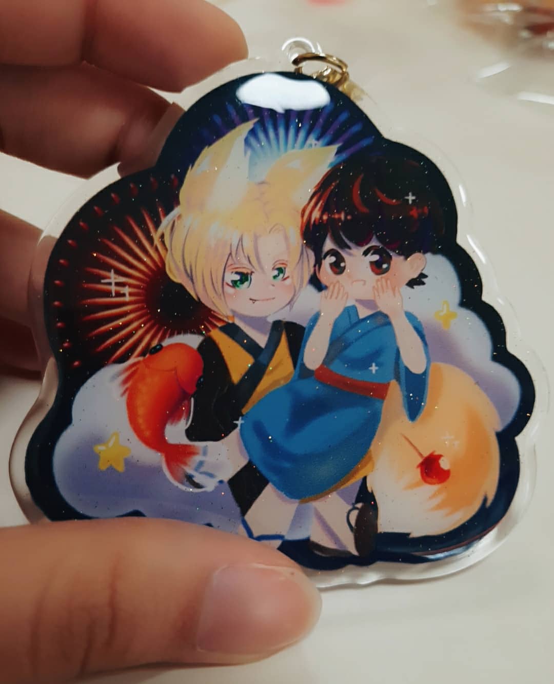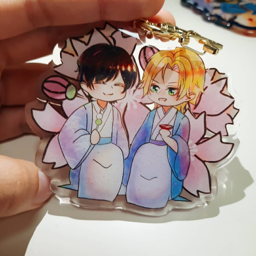 是bananafish的壓克力!是亞修和英二到日本一起生活的if(இωஇ )私心想看他們在日本幸福快樂,以四季為主題,目前出了春和夏,這次的壓克力有閃粉,在陽光下很漂亮,還用了星星扣喔( • ̀ω•́ )✧有滴膠封面很厚實 大小(8cm)