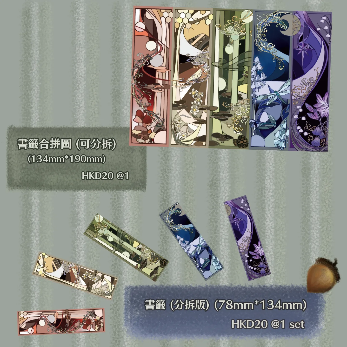 可整張A5 size(134mm*190mm),或拆分為5張(78mm*134mm)書籤(每色各一)購買
