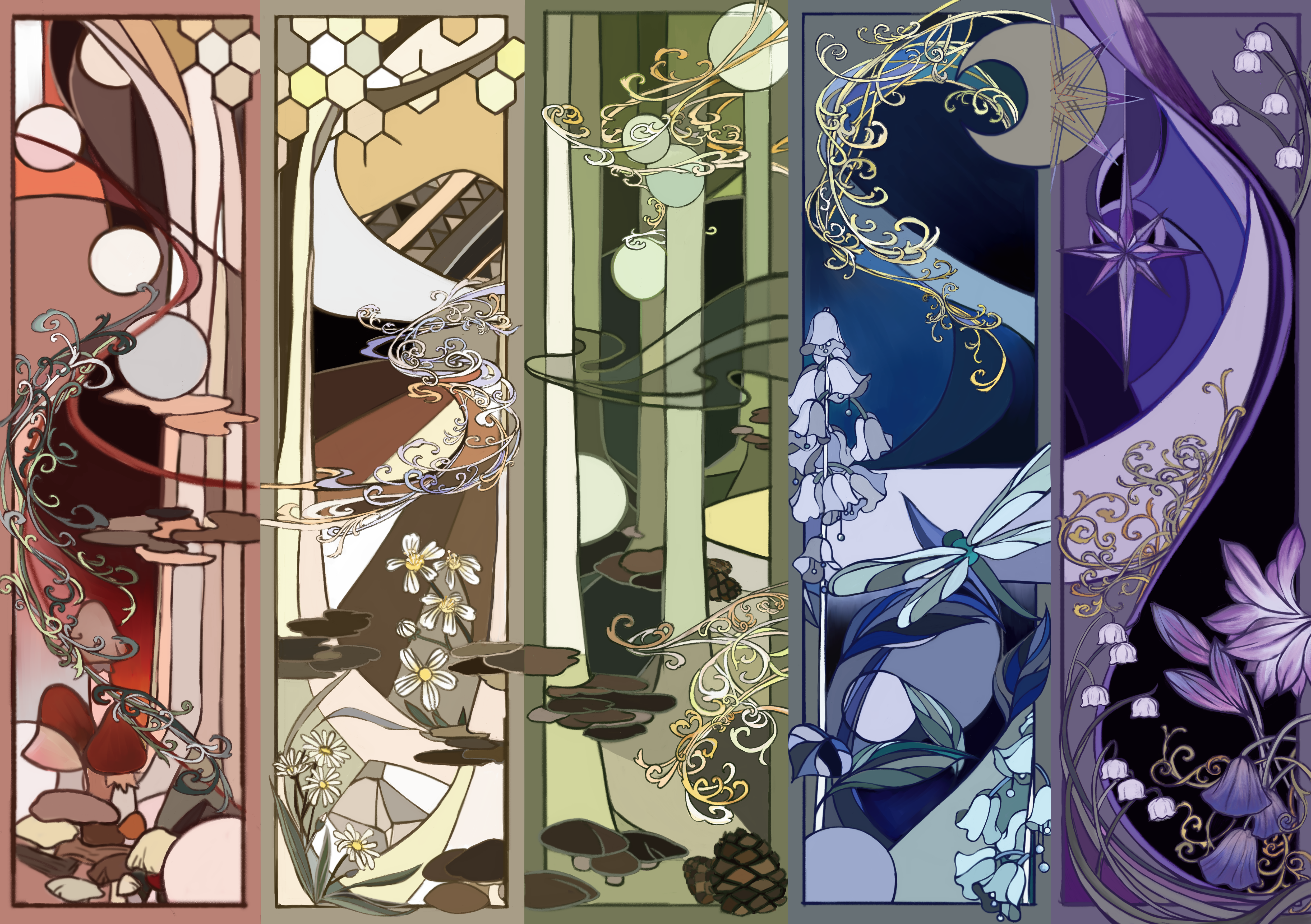 紅黃綠藍紫5色,輕魔幻繪本風樹林風景圖