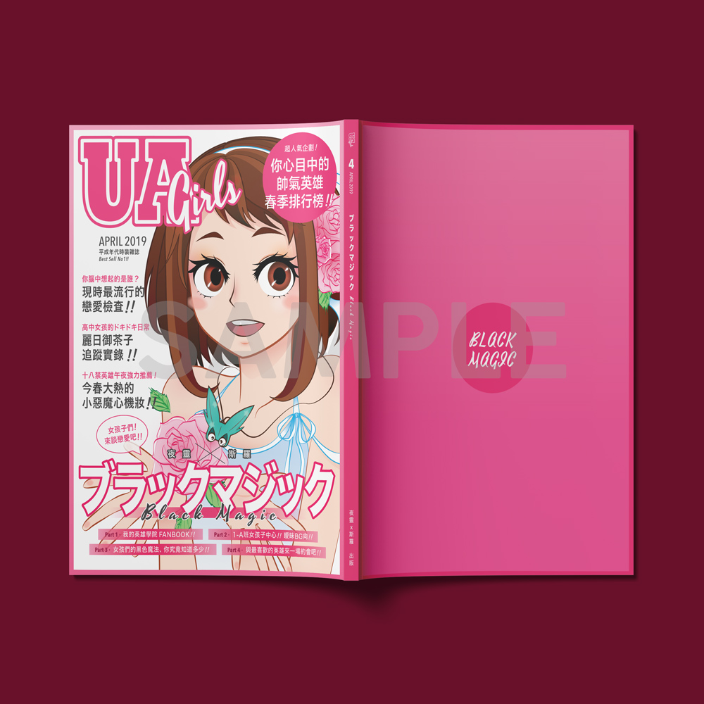 刊物資料:▽ 書名:《BLACK MAGIC》▽ 作者:夜靈、斯羅▽ 出版:銀星夜空▽ 原作:我的英雄學院▽ 角色:1-A班女子中心,微BG官配▽ 字數:約2.7萬字▽ 規格:A5右翻/82頁▽ 場販價格:180NTD/40HKD