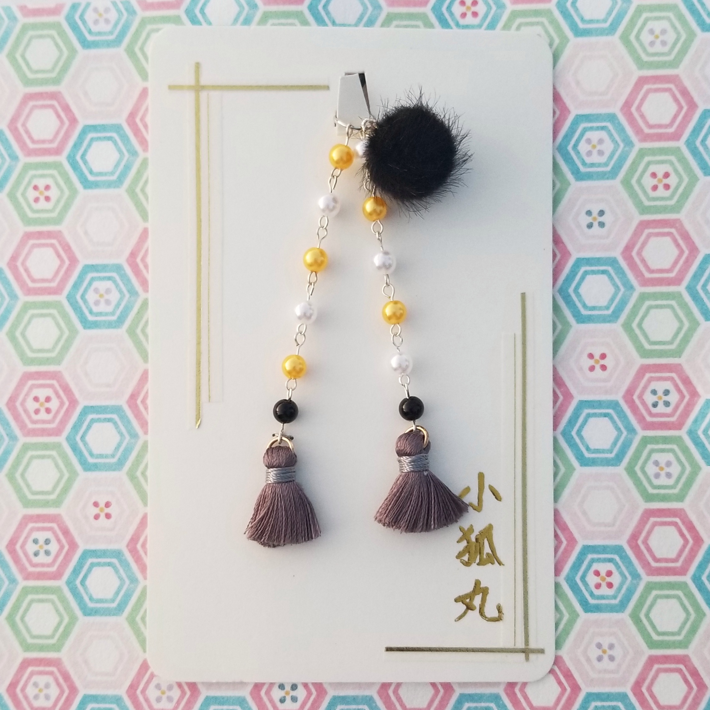 黃色外衣、白色長髮、黑色毛毛球