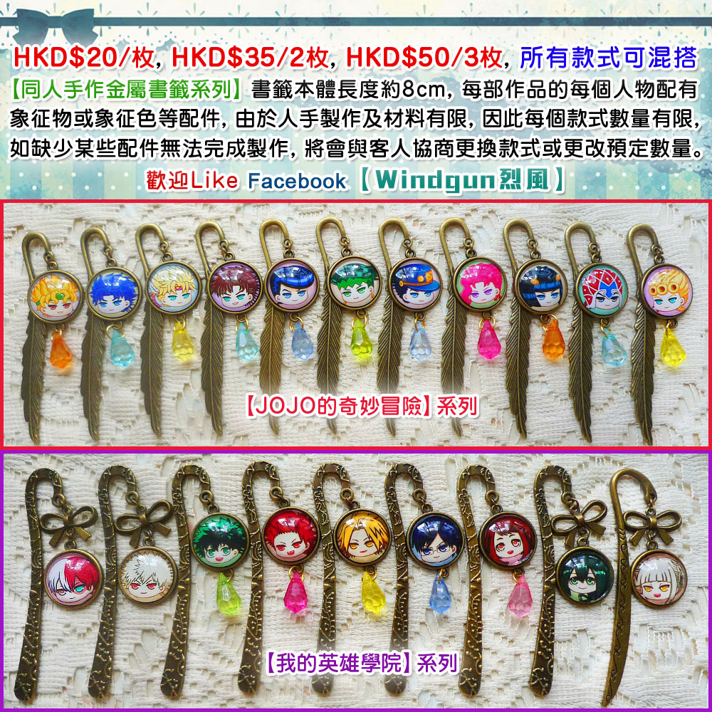 【同人手作金屬書籤系列】書籤本體長度約8cm, 每部作品的每個人物配有象征物或象征色等配件, 由於人手製作及材料有限, 因此每個款式數量有限, 如缺少某些配件無法完成製作, 將會與客人協商更換款式或更改預定數量。