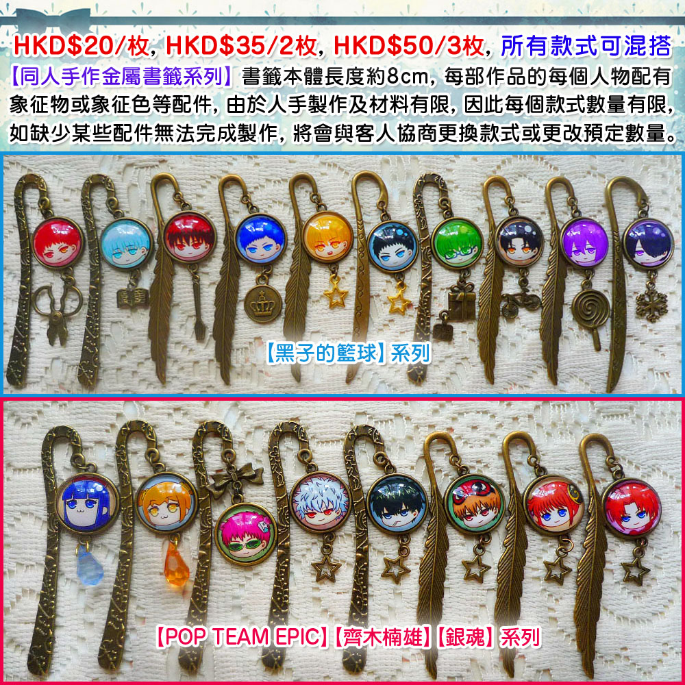 【同人手作金屬書籤系列】書籤本體長度約8cm, 每部作品的每個人物配有象征物或象征色等配件, 由於人手製作及材料有限, 因此每個款式數量有限, 如缺少某些配件無法完成製作, 將會與客人協商更換款式或更改預定數量。
